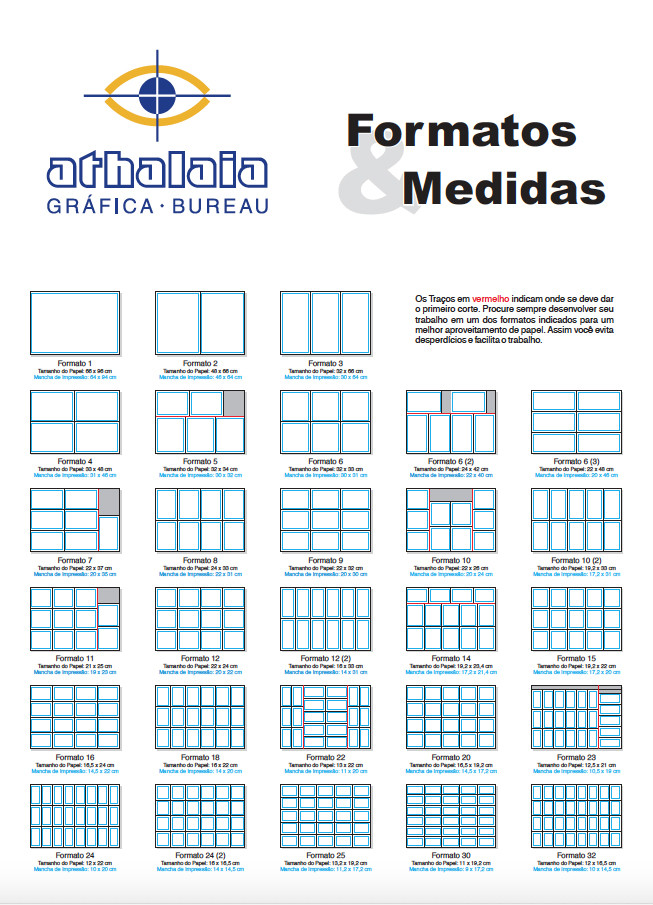 Uma dica para publicações é escolher os formatos com o corte central e divisão par (ver Formatos a seguir, número 8, 12, 16, etc). Assim evita-se jogar papel fora…