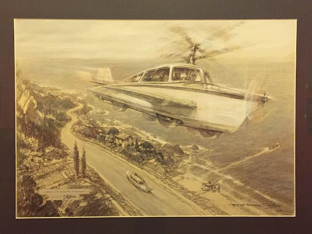 Para os designers gráficos, o segundo andar é particularmente interessante por reunir dezenas de cartazes publicitários de automóveis, salões e competições, ao lado de ilustrações e pinturas originais. Dentre estas, destaca-se a produção do inglês Frederick Gordon Crosby (1885-1943). Ilustrador da revista Autocar durante três décadas, seu trabalho reflete a emoção e o glamour que cercaram o nascimento e o desenvolvimento da indústria automotiva, incluindo competições famosas como as 24 horas de Le Mans e o Rally de Monte Carlo. Além de ilustrar carros-conceito – como o carro-barco-voador Autohydrogyro, de 1936 (abaixo) – ele é creditado como o responsável pelo design do símbolo da marca de automóveis Jaguar, no final dos anos 1930.